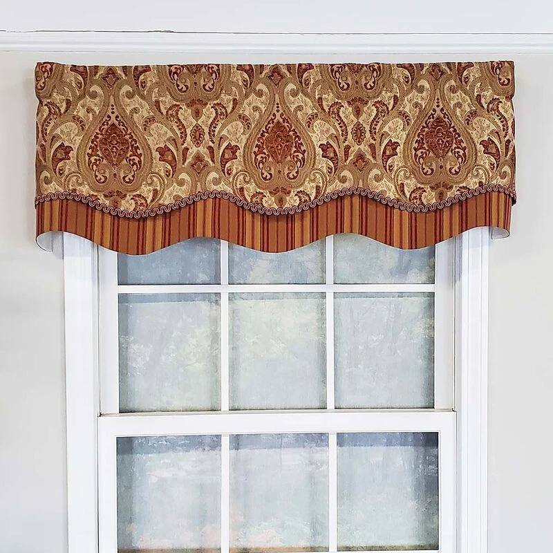 The valance is made of chenille-like fabric with a damask motive over a coordinating stripe. Chenille is a type of fabric that is made with raised loops, which gives it a soft and luxurious feel. The damask motive is a traditional design that is characterized by its intricate patterns and symmetrical shapes. The coordinating stripe adds a touch of contrast and interest. The valance fits windows up to 48″ wide. If you have a wider window, you can use multiple valances to cover the entire width. The valance can be hung flat or gathered. If you hang it flat, it will have a clean, minimalist look. If you hang it gathered, it will have a more traditional, elegant look. The valance has a 3″ rod pocket that fits perfectly on a 2-1/2″ continental rod. However, it can also be used with a regular 3/4″ curtain rod or a decorative pole up to 1-3/8″ diameter.