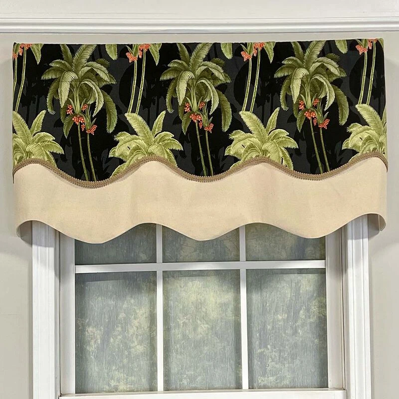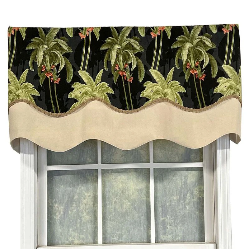 This valance features a beautiful tropical print of palm trees, with a coordinating bottom layer and gimp trim. It is made of high-quality fabric that is both durable and stylish. The valance measures 48″ wide and can be hung flat or gathered, making it a versatile addition to any home. The valance fits windows up to 48″ wide, but you can use multiple valances for wider windows. It has a 3″ rod pocket that fits perfectly on a 2-1/2″ continental rod, but it can also be used with a regular 3/4″ curtain rod or a decorative pole up to 1-3/8″ diameter. The valance is machine-washable and dryable, making it easy to care for. It is a great way to add a touch of tropical style to your home, and it would look great in a variety of settings, from a beach house to a modern living room.